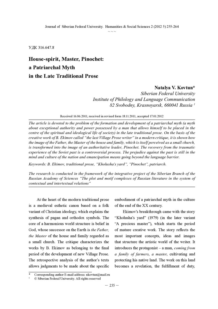 Библиографическое описание: Kovtun, Natalya. House-spirit, Master, Pinochet: a Patriarchal Myth in the Late Traditional Prose = Домовой, Хозяин, Пиночет: патриархальный миф в поздней традиционалистской прозе / N. V. Kovtun. - Текст : непосредственный // Журнал Сибирского федерального университета. Гуманитарные науки. - 2012. - Т. 5, № 2. - С. 255-264. - Библиогр.: с. 263. - ISSN 1997-1370.