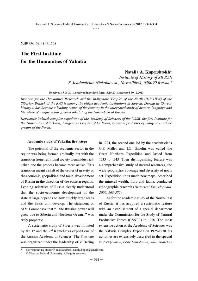 Библиографическое описание: Kupershtokh, Natalia. The First Institute for the Humanities of Yakutia = Первый гуманитарный институт Якутии / N. A. Kupershtokh. - Текст : непосредственный // Журнал Сибирского федерального университета. Гуманитарные науки. - 2012. - Т. 5, № 3. - С. 324-334. - Библиогр.: с. 332-333 (14 назв.). - ISSN 1997-1370.