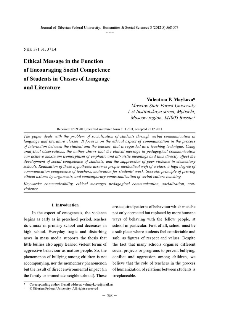 Библиографическое описание:Maykova, Valentina. Ethical Message in the Function of Encouraging Social Competence of Students in Classes of Language and Literature = Этический фактор как функция стимулирования социальной компетентности в процессе обучения / V. P. Maykova. - Текст : непосредственный // Журнал Сибирского федерального университета. Гуманитарные науки. - 2012. - Т. 5, № 4. - С. 568-573. - Библиогр.: с. 573. - ISSN 1997-1370.