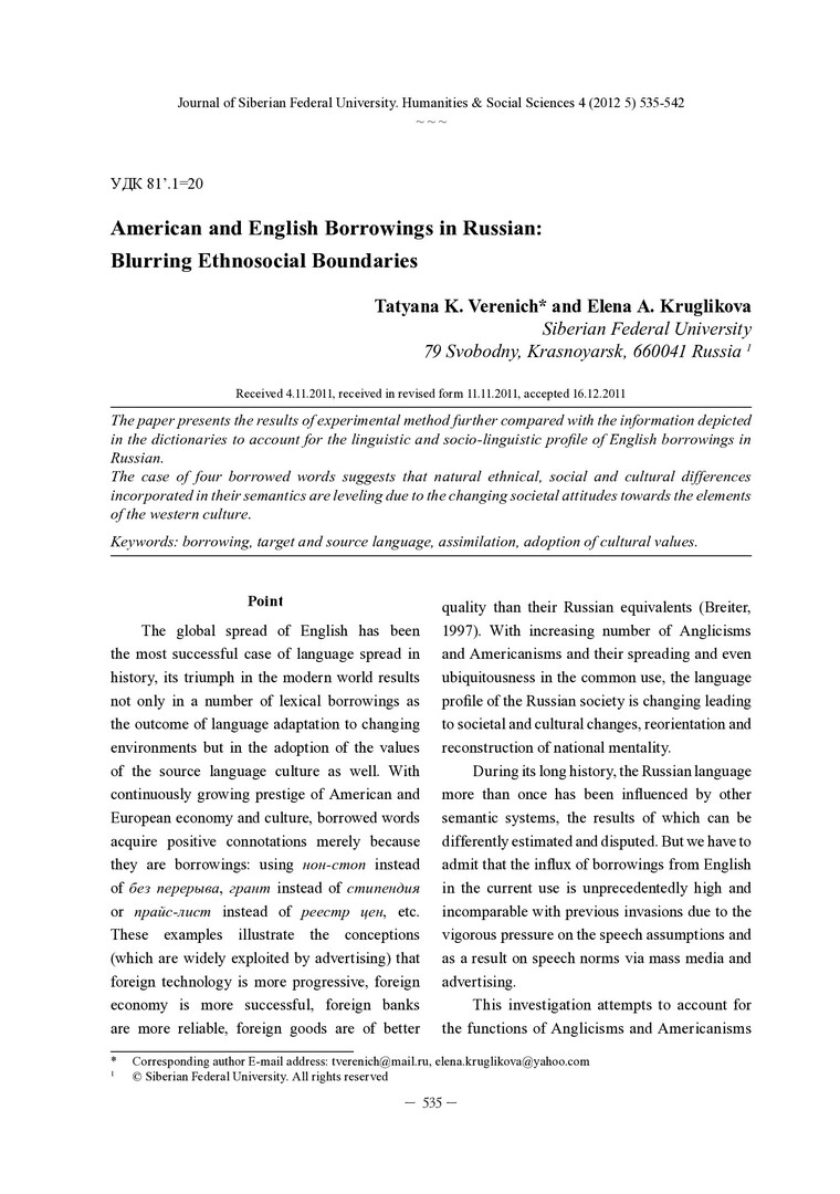 Библиографическое описание: Verenich, Tatyana. American and English Borrowings in Russian: Blurring Ethnosocial Boundaries = Англо-американские заимствования в русском языке: стирание этносоциокультурных границ / T. K. Verenich, E. A. Kruglikova. - Текст : непосредственный // Журнал Сибирского федерального университета. Гуманитарные науки. - 2012. - Т. 5, № 4. - С. 535-542. - Библиогр.: с. 541-542. - ISSN 1997-1370.