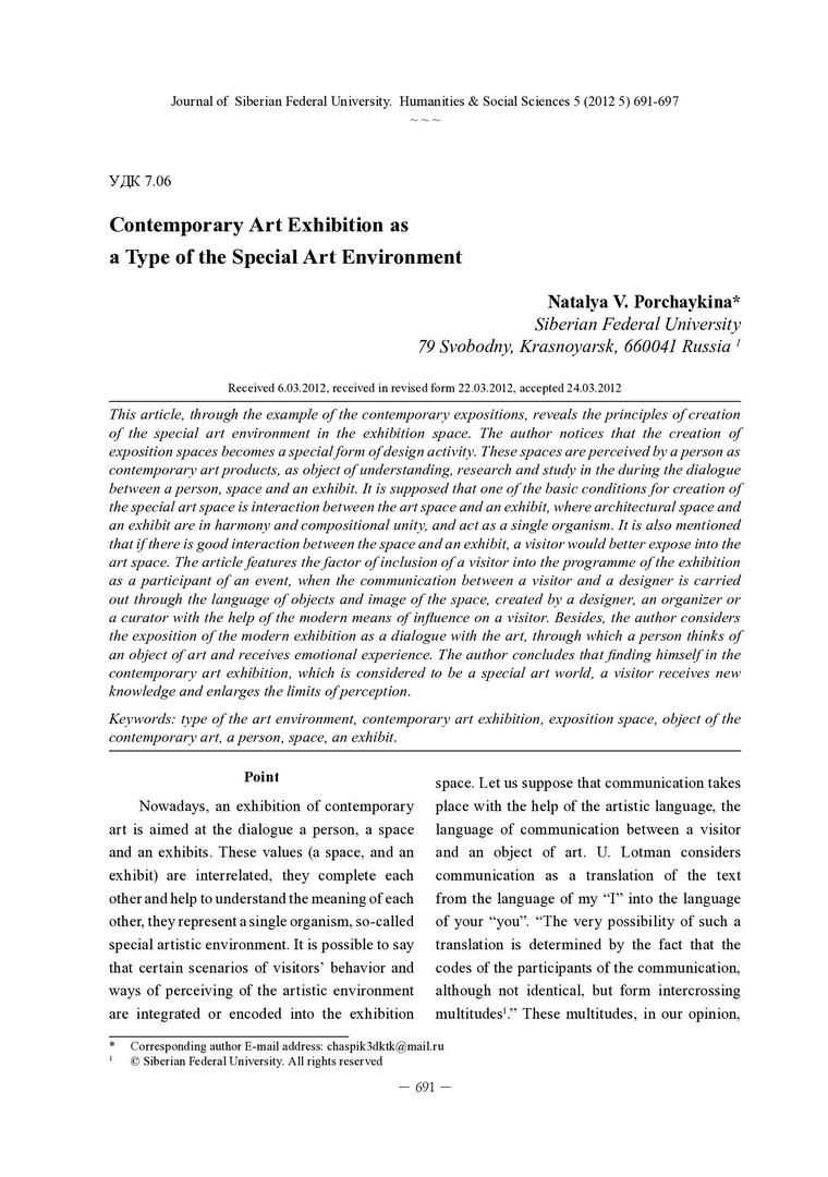 Библиографическое описание: Porchaykina, Natalya. Contemporary Art Exhibition as a Type of the Special Art Environment = Выставка современного искусства как тип особой художественной среды / N. V. Porchaykina. - Текст : непосредственный // Журнал Сибирского федерального университета. Гуманитарные науки. - 2012. - Т. 5, № 5. - С. 691-697. - Библиогр.: с. 695-696. - ISSN 1997-1370.