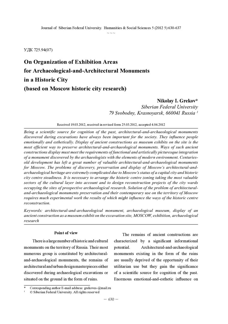 Библиографическое описание: Grekov, Nikolay. On Organization of Exhibition Areas for Archaeological-and-Architectural Monuments in a Histiric City (based on Moscow historic city research) = Об организации экспозиционных пространств памятников археологической архитектуры в историческом городе (на примере Москвы) / N. I. Grekov. - Текст : непосредственный // Журнал Сибирского федерального университета. Гуманитарные науки. - 2012. - Т. 5, № 5. - С. 630-637 : ил. - Библиогр.: с. 636-637. - ISSN 1997-1370.