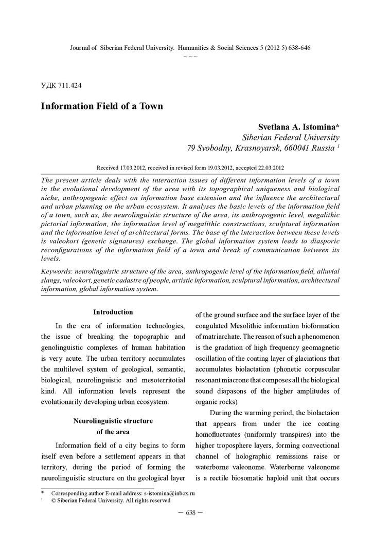 Библиографическое описание: Istomina, Svetlana. Information Field of a Town = Информационное поле города / S. A. Istomina. - Текст : непосредственный // Журнал Сибирского федерального университета. Гуманитарные науки. - 2012. - Т. 5, № 5. - С. 638-646. - Библиогр.: с. 643. - ISSN 1997-1370.