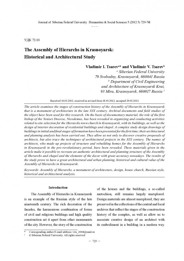 Библиографическое описание: Tsarev, Vladimir. The Assembly of Hierarchs in Krasnoyarsk: Historical and Architectural Study = Архиерейский дом в Красноярске: историко-архитектурное исследование / V. I. Tsarev, V. V. Tsarev. - Текст : непосредственный // Журнал Сибирского федерального университета. Гуманитарные науки. - 2012. - Т. 5, № 5. - С. 729-741 : ил. - Библиогр.: с. 740-741. - ISSN 1997-1370.