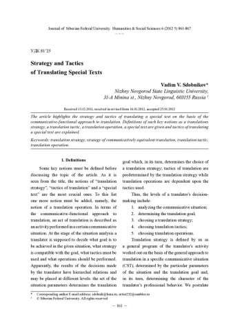 Библиографическое описание:Sdobnikov, Vadim. Strategy and Tactics of Translating Special Texts = Стратегия и тактики переводов специальных текстов / V. V. Sdobnikov. - Текст : непосредственный // Журнал Сибирского федерального университета. Гуманитарные науки. - 2012. - Т. 5, № 6. - С. 861-867. - Библиогр.: с. 867. - ISSN 1997-1370.