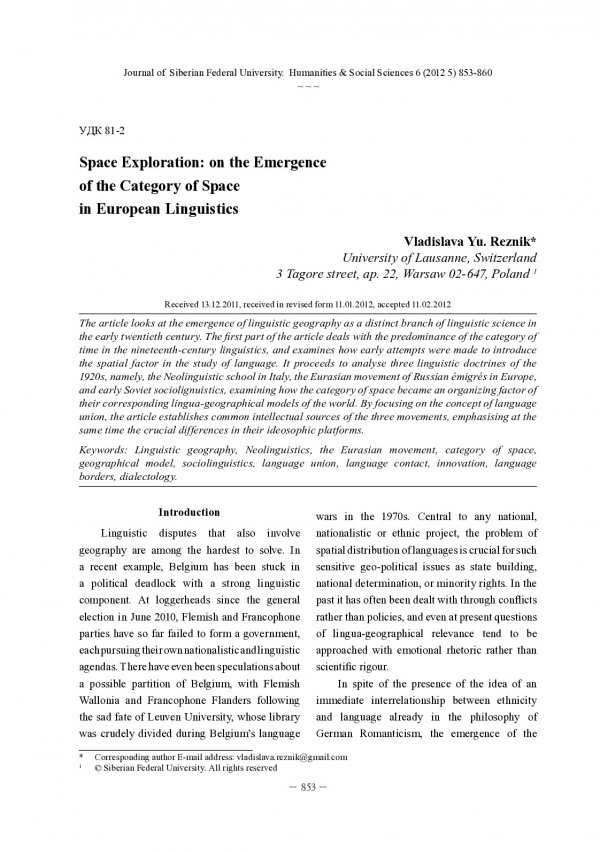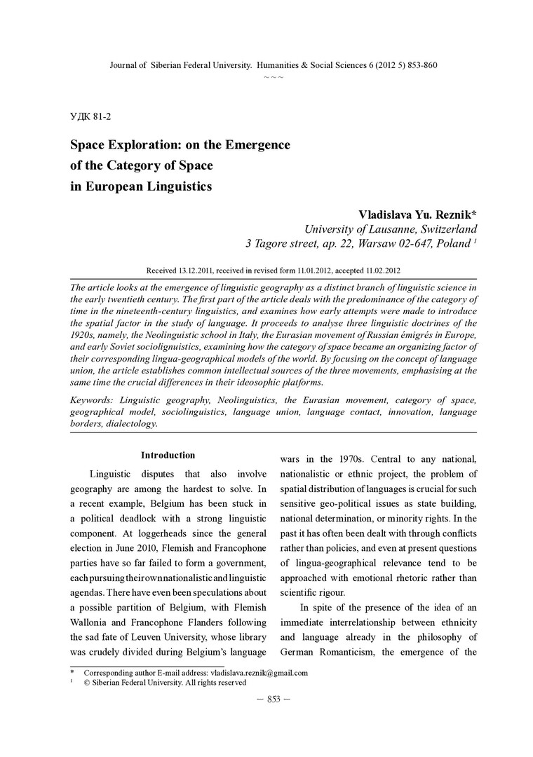 Библиографическое описание:Reznik, Vladislava. Space Exploration: on the Emergence of the Category of Space in European Linguistics = Исследование пространства: возникновение категории пространства в европейском языкознании начала ХХ века / V. Yu. Reznik. - Текст : непосредственный // Журнал Сибирского федерального университета. Гуманитарные науки. - 2012. - Т. 5, № 6. - С. 853-860. - Библиогр.: с. 859-860. - ISSN 1997-1370.