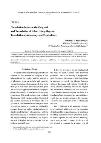Библиографическое описание:Sokolovsky, Yaroslav. Correlation between the Original and Translation of Advertising Slogans: Translational Autonomy and Equivalence = Соотношение оригинала и перевода текстов рекламных слоганов: переводческая автономия и эквивалентность / Y. V. Sokolovsky. - Текст : непосредственный // Журнал Сибирского федерального университета. Гуманитарные науки. - 2012. - Т. 5, № 6. - С. 868-873 : табл. - Библиогр.: с. 873. - ISSN 1997-1370.