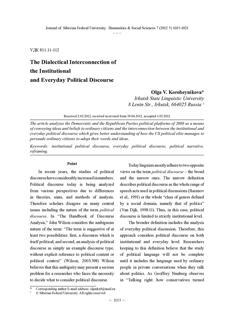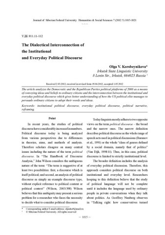 Библиографическое описание:Korobeynikova, Olga. The Dialectical Interconnection of the Institutional and Everyday Political Discourse = О диалектическом взаимодействии институционального и бытийного политического дискурса / O. V. Korobeynikova. - Текст : непосредственный // Журнал Сибирского федерального университета. Гуманитарные науки. - 2012. - Т. 5, № 7. - С. 1015-1021 : 3 табл. - Библиогр.: с. 1020-1021. - ISSN 1997-1370.
