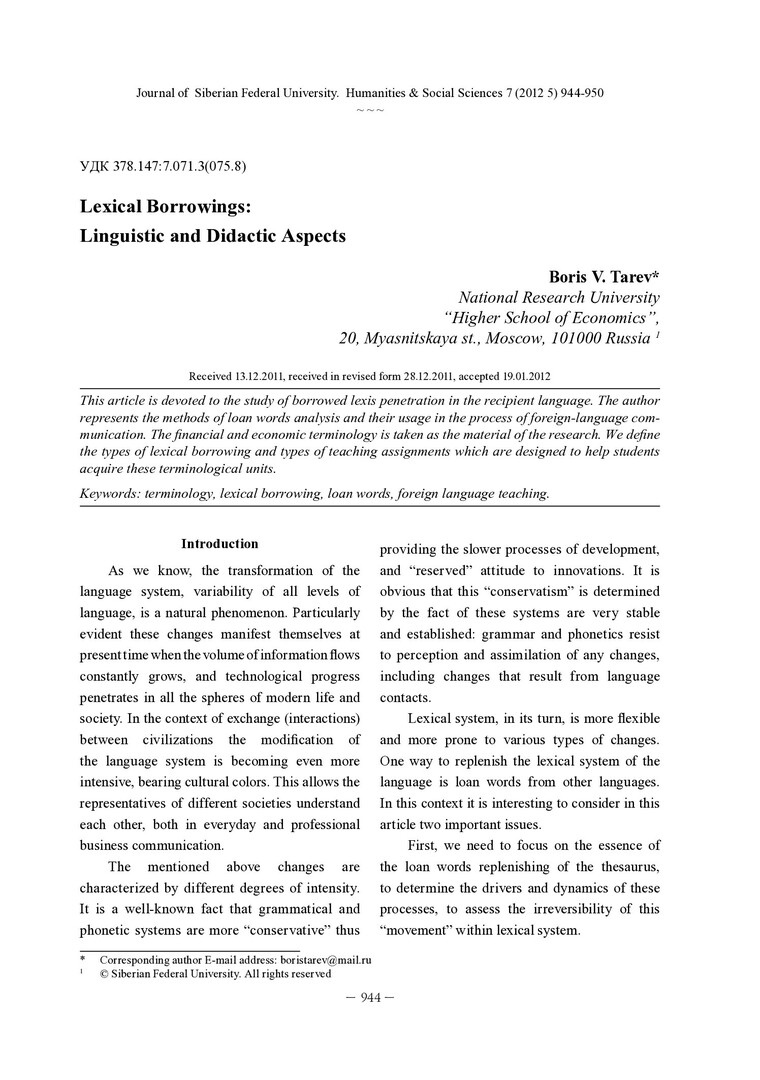 Библиографическое описание: Tarev, Boris. Lexical Borrowings: Linguistic and Didactic Aspects = Лексические заимствования: лингвистический и лингводидактический аспекты / B. V. Tarev. - Текст : непосредственный // Журнал Сибирского федерального университета. Гуманитарные науки. - 2012. - Т. 5, № 7. - С. 944-950. - Библиогр.: с. 950. - ISSN 1997-1370.