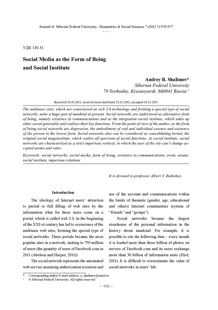 Библиографическое описание: Shalimov, Andrey. Social Media as the Form of Being and Social Institute = Социальные медиа как форма бытия и социальный институт / A. B. Shalimov. - Текст : непосредственный // Журнал Сибирского федерального университета. Гуманитарные науки. - 2012. - Т. 5, № 7. - С. 970-977. - Библиогр.: с. 976-977. - ISSN 1997-1370.