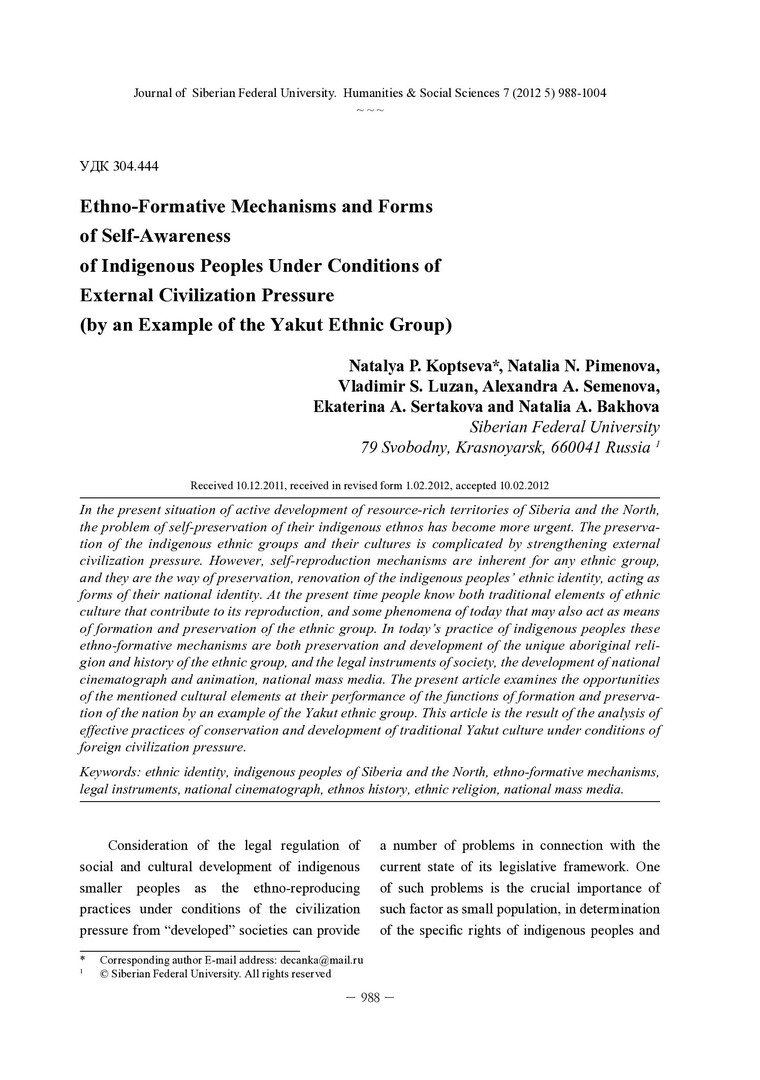 Библиографическое описание: Ethno-Formative Mechanisms and Forms of Self-Awareness of Indigenous Peoples Under Conditions of External Civilization Pressure (by an Example of the Yakut Ethnic Group) = Этнообразующие механизмы и формы самосознания коренных народов в условиях внешнего цивилизованного давления (на примере якутского этноса) / N. P. Koptseva [et al.]. - Текст : непосредственный // Журнал Сибирского федерального университета. Гуманитарные науки. - 2012. - Т. 5, № 7. - С. 988-1004. - Библиогр.: с. 1000-1004. - ISSN 1997-1370.