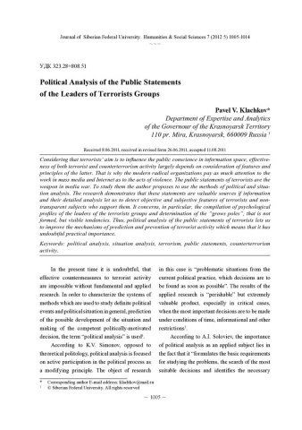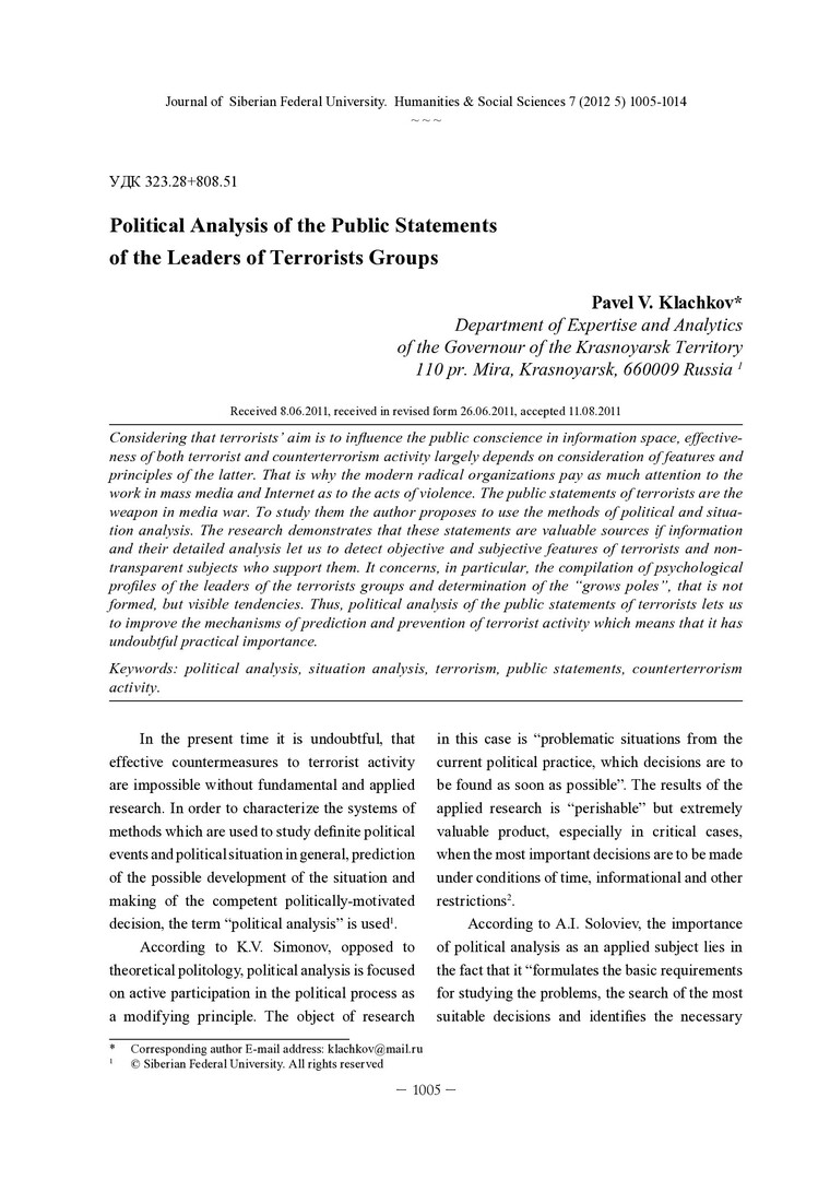 Библиографическое описание: Klachkov, Pavel. Political Analysis of the Public Statements of the Leaders of Terrorists Group = Политический анализ публичных заявлений лидеров террористических групп / P. V. Klachkov. - Текст : непосредственный // Журнал Сибирского федерального университета. Гуманитарные науки. - 2012. - Т. 5, № 7. - С. 1005-1014. - Библиогр.: с. 1012-1013. - ISSN 1997-1370.