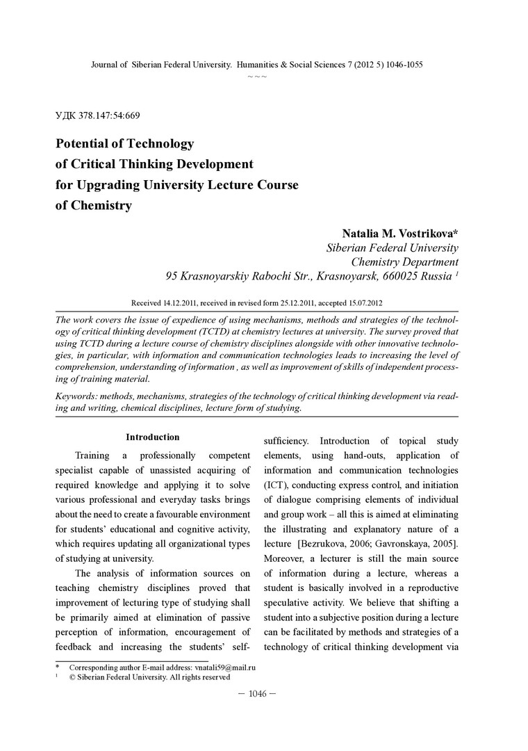Библиографическое описание:Vostrikova, Natalia. Potential of Technology of Critical Thinking Development for Upgrading University Lecture Course of Chemistry = Возможности технологии развития критического мышления в модернизации лекционного курса химии в вузе / N. M. Vostrikova. - Текст : непосредственный // Журнал Сибирского федерального университета. Гуманитарные науки. - 2012. - Т. 5, № 7. - С. 1046-1055. - Библиогр.: с. 1055. - ISSN 1997-1370.