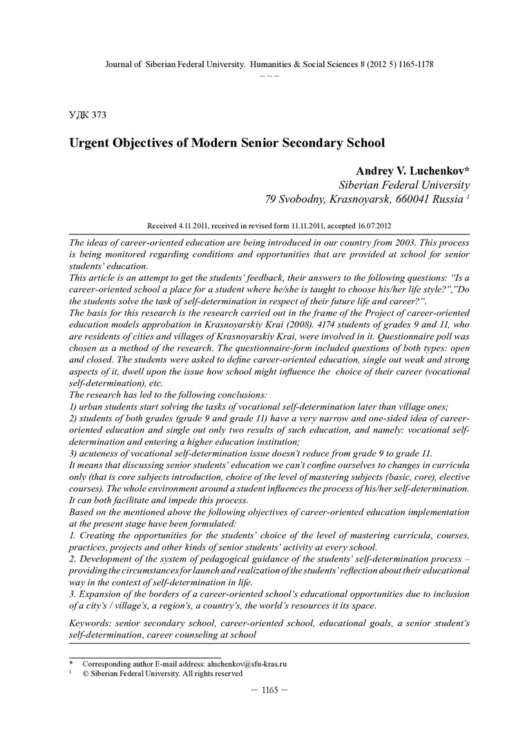 Библиографическое описание: Luchenkov, Andrey. Urgent Objectives of Modern Senior Secondary School = Актуальные задачи современной старшей школы / A. V. Luchenkov. - Текст : непосредственный // Журнал Сибирского федерального университета. Гуманитарные науки. - 2012. - Т. 5, № 8. - С. 1165-1178 : ил. - Библиогр.: с. 1175-1177. - ISSN 1997-1370.