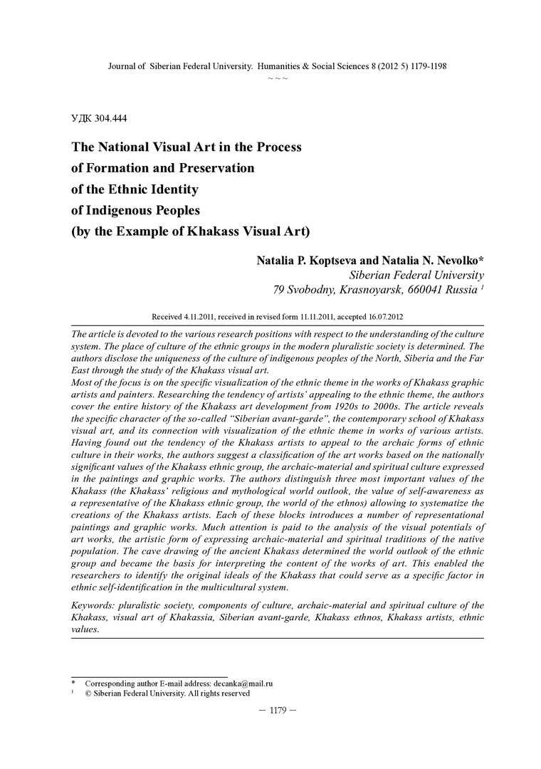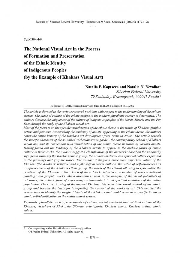 Библиографическое описание: Koptseva, Natalia. The National Visial Art in the Process of Formation and Preservation of the Ethnic Identity of the Indigenous Peoples (by the Example of Khakass Visual Art) = Национальное изобразительное искусство в процессе формирования и сохранения этнической идентичности коренных малочисленных народов (на примере хакасского изобразительного искусства) / N. P. Koptseva, N. N. Nevolko. - Текст : непосредственный // Журнал Сибирского федерального университета. Гуманитарные науки. - 2012. - Т. 5, № 8. - С. 1179-1198 : ил. - Библиогр.: с. 1196-1198. - ISSN 1997-1370.