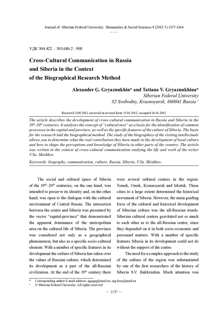 Cross-Cultural Communication in Russia and Siberia in the Context of the Biographical Research Methodстатья из журнала