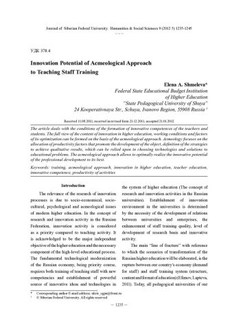 Библиографическое описание: Shmeleva, Elena. Innovation Potential of Acmeological Approach to Teaching Staff Training = Инновационный потенциал акмеологического подхода в подготовке педагогических кадров / E. A. Shmeleva. - Текст : непосредственный // Журнал Сибирского федерального университета. Гуманитарные науки. - 2012. - Т. 5, № 9. - С. 1235-1245 : ил. - Библиогр.: с. 1244-1245. - ISSN 1997-1370.