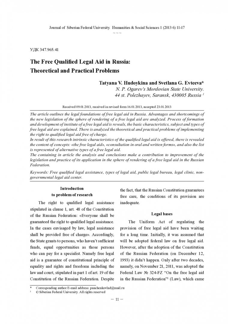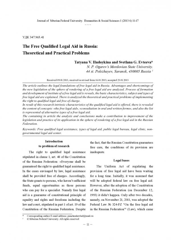 Библиографическое описание: Hudoykina, Tatyana. The Free Qualified Legal Aid in Russia = Бесплатная квалифицированная юридическая помощь в России: теоретические и практические проблемы / T. V. Hudoykina, S. G. Evteeva. - Текст : непосредственный // Журнал Сибирского федерального университета. Гуманитарные науки. - 2013. - Т. 6, № 1. - С. 11-17. - Библиогр.: с. 16. - ISSN 1997-1370.