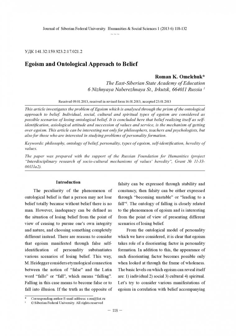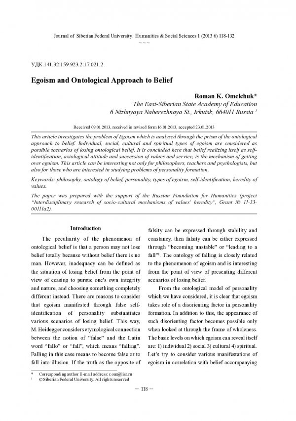 Библиографическое описание: Omelchuk, Roman. Egoism and Ontological Approach to Belief = Эгоизм и онтологический подход к вере / R. K. Omelchuk. - Текст : непосредственный // Журнал Сибирского федерального университета. Гуманитарные науки. - 2013. - Т. 6, № 1. - С. 118-132. - Библиогр.: с. 130-131 (28 назв.). - ISSN 1997-1370.