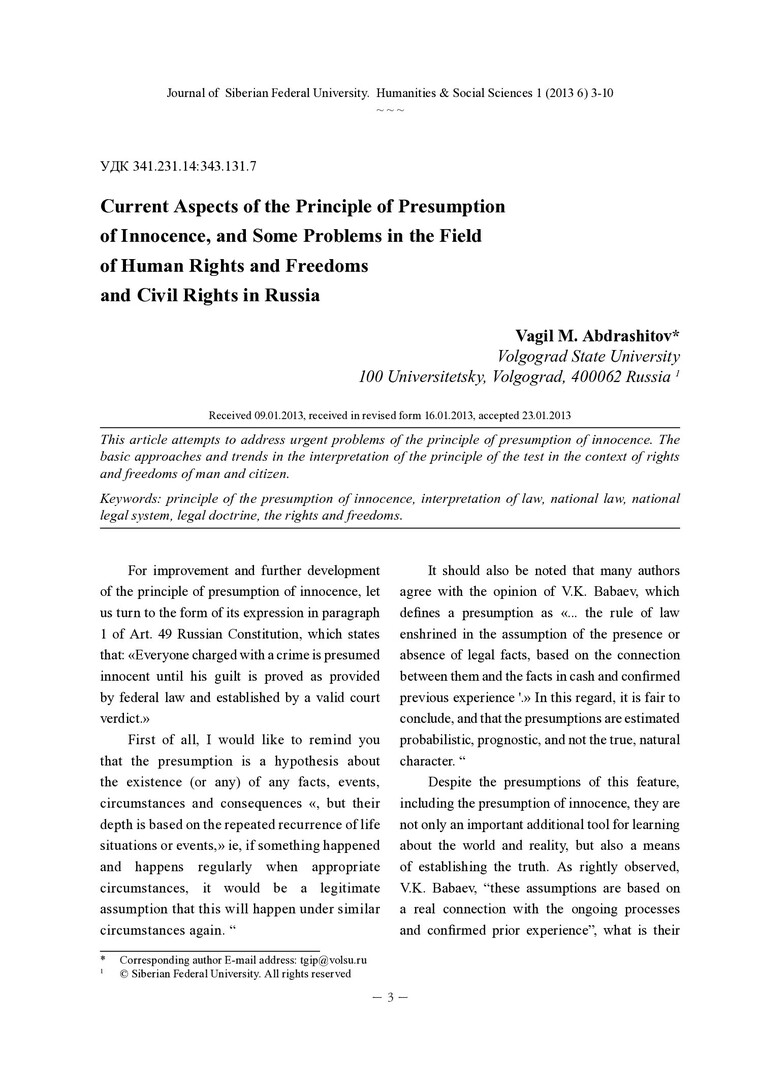 Библиографическое описание:Abdrashitov, Vagil. Current Aspects of the Principle of Presumption of Innocence, and Some Problems in the Field of Human Rights and Freedoms and Civil Rights in Russia = Актуальные аспекты содержания принципа презумпции невиновности и некоторые проблемы в области прав и свобод человека и гражданина в современной России / V. M. Abdrashitov. - Текст : непосредственный // Журнал Сибирского федерального университета. Гуманитарные науки. - 2013. - Т. 6, № 1. - С. 3-10. - Библиогр.: с. 8-9. - ISSN 1997-1370.