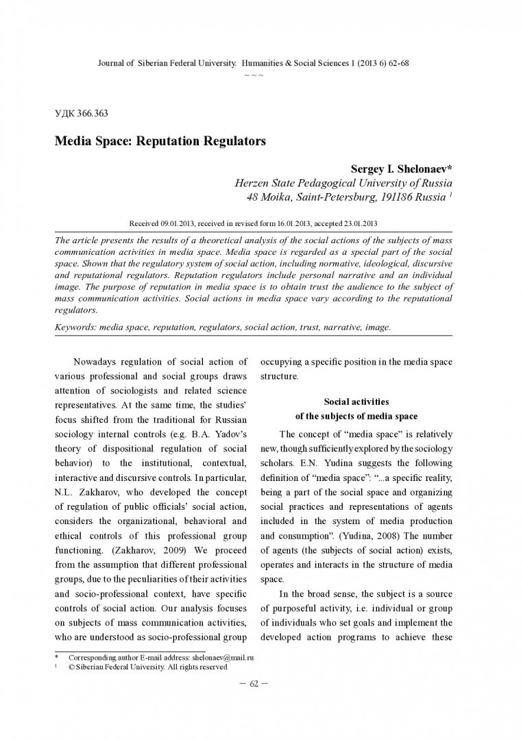 Библиографическое описание: Shelonaev, Sergey. Media Space: Reputation Regulators = Медиапространство: репутационные регуляторы / S. I. Shelonaev. - Текст : непосредственный // Журнал Сибирского федерального университета. Гуманитарные науки. - 2013. - Т. 6, № 1. - С. 62-68. - Библиогр.: с. 67-68. - ISSN 1997-1370.