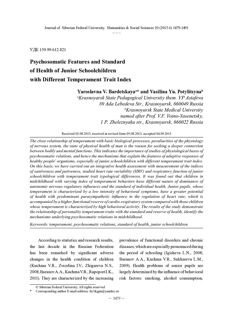 Библиографическое описание: Bardetskaya, Yaroslavna. Psychosomatic Features and Standard of Health of Junior Schoolchildren with Different Temperament Trait Index = Психосоматические особенности и уровень здоровья у детей младшего школьного возраста с разной выраженностью темпераментальных черт / Ya. V. Bardetskaya, V. Yu. Potylitsyna. - Текст : непосредственный // Журнал Сибирского федерального университета. Гуманитарные науки. - 2013. - Т. 6, № 10. - С. 1479-1491. - Библиогр.: с. 1485-1490 (51 назв.). - ISSN 1997-1370.