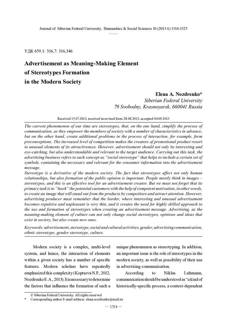 Библиографическое описание: Nozdrenko, Elena. Advertisement as Meaning-Making Element of Stereotypes Formation in the Modern Society = Реклама как смыслообразующий элемент формирования стереотипов в современном обществе / E. A. Nozdrenko. - Текст : непосредственный // Журнал Сибирского федерального университета. Гуманитарные науки. - 2013. - Т. 6, № 10. - С. 1514-1525. - Библиогр.: с. 1524-1525 (22 назв.). - ISSN 1997-1370.