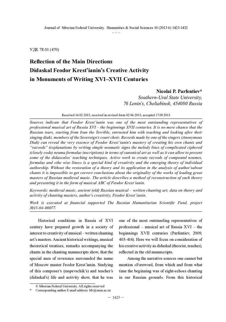 Библиографическое описание: Parfentiev, Nicolai. Reflection of the Main Directions Didaskal Feodor Krest’ianin’s Creative Activity in Monuments of Writing XVI–XVII Centuries = Отражение основных направлений творческой деятельности дидаскала Федора Крестьянина в памятниках письменности XVI–XVII вв. / N. P. Parfentiev. - Текст : непосредственный // Журнал Сибирского федерального университета. Гуманитарные науки. - 2013. - Т. 6, № 10. - С. 1423-1432. - Библиогр.: с. 1430-1431 (12 назв.). - ISSN 1997-1370.
