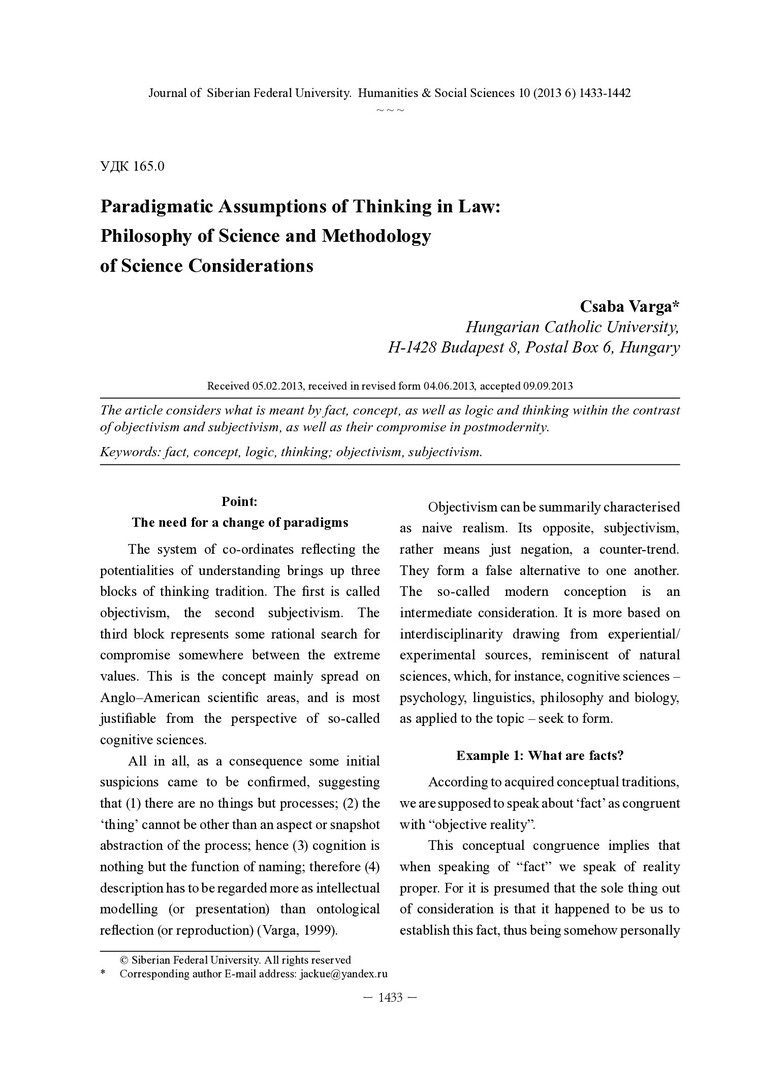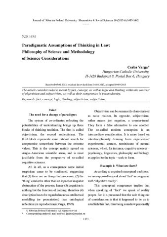 Библиографическое описание:Varga, Csaba. Paradigmatic Assumptions of Thinking in Law: Philosophy of Science and Methodology of Science Considerations = Парадигмальные предположения мышления в праве: философия науки и методология научного суждения / Csaba Varga. - Текст : непосредственный // Журнал Сибирского федерального университета. Гуманитарные науки. - 2013. - Т. 6, № 10. - С. 1433-1442. - Библиогр.: с. 1440-1441 (20 назв.). - ISSN 1997-1370.