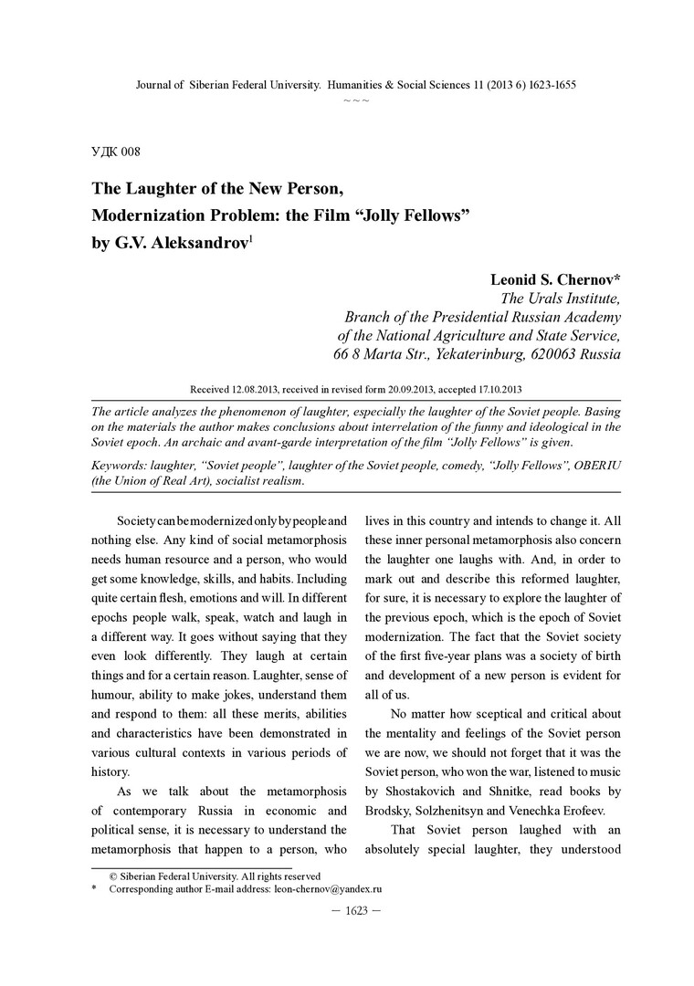 Библиографическое описание:Chernov, Leonid. The Laughter of the New Person, Modernization Problem: the Film “Jolly Fellows” by G.V. Aleksandrov = Смех нового человека, к проблеме модернизации: фильм Г. В. Александрова «Весёлые ребята» / L. S. Chernov. - Текст : непосредственный // Журнал Сибирского федерального университета. Гуманитарные науки. - 2013. - Т. 6, № 11. - С. 1623-1655. - Библиогр.: с. 1653-1655 (73 назв.). - ISSN 1997-1370.