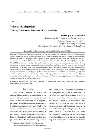 Библиографическое описание: Fabrykant, Marharyta. Value of (Expla)nation: Testing Modernist Theories of Nationalism = Значение нации: тестирование модернистских теорий национализма / M. S. Fabrykant. - Текст : непосредственный // Журнал Сибирского федерального университета. Гуманитарные науки. - 2013. - Т. 6, № 11. - С. 1656-1672 : табл. - Библиогр.: с. 1668-1669 (35 назв.). - ISSN 1997-1370.