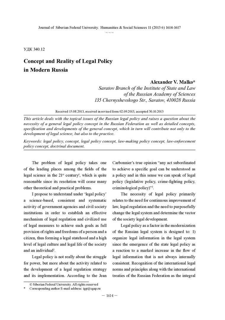 Concept and Reality of Legal Policy in Modern Russiaстатья из журнала