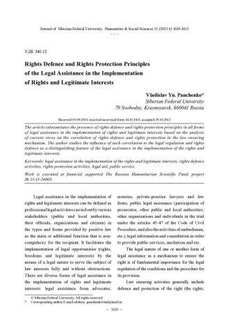 Библиографическое описание:Panchenko, Vladislav. Rights Defence and Rights Protection Principles of the Legal Assistance in the Implementation of Rights and Legitimate Interests = Правозащитное и правоохранительное начала в юридическом содействии реализации прав и законных интересов / V. Yu. Panchenko. - Текст : непосредственный // Журнал Сибирского федерального университета. Гуманитарные науки. - 2013. - Т. 6, № 11. - С. 1610-1613. - ISSN 1997-1370.