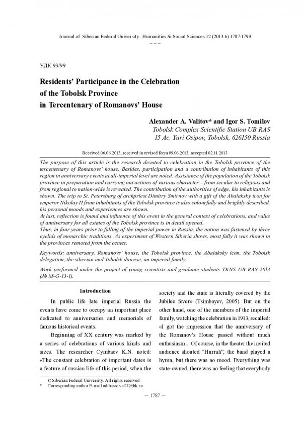 Библиографическое описание: Valitov, Alexander. Residents’ Participance in the Celebration of the Tobolsk Province in Tercentenary of Romanovs’ House = Празднование юбилея дома Романовых в Тобольской губернии / A. А. Valitov, I. S. Tomilov. - Текст : непосредственный // Журнал Сибирского федерального университета. Гуманитарные науки. - 2013. - Т. 6, № 12. - С. 1787-1799. - Библиогр.: с. 1798-1799 (15 назв.). - ISSN 1997-1370.