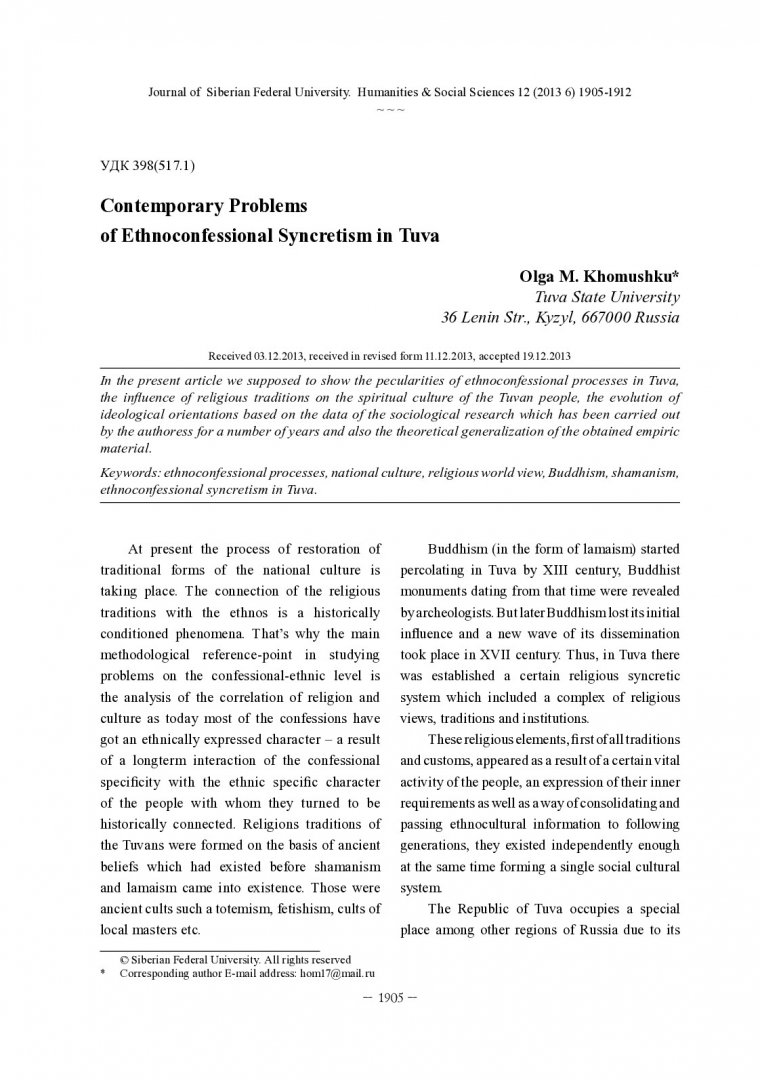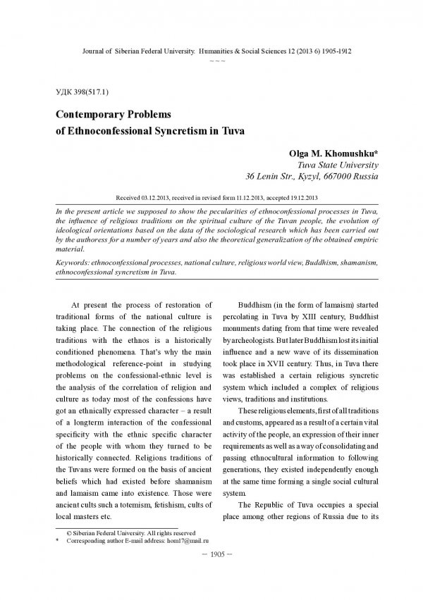Библиографическое описание: Khomushku, Olga. Contemporary Problems of Ethnoconfessional Syncretism in Tuva = Современные проблемы этноконфессионального синкретизма в Тыве / O. M. Khomushku. - Текст : непосредственный // Журнал Сибирского федерального университета. Гуманитарные науки. - 2013. - Т. 6, № 12. - С. 1905-1912. - Библиогр.: с. 1911-1912 (2 назв.). - ISSN 1997-1370.