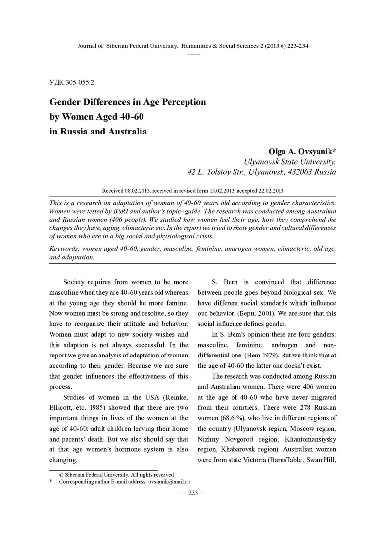Библиографическое описание:Ovsyanik, Olga. Gender Differences in Age Perception by Women Aged 40-60 in Russia and Australia = Гендерные различия женщин 40-60 лет в России и Австралии / O. A. Ovsyanik. - Текст : непосредственный // Журнал Сибирского федерального университета. Гуманитарные науки. - 2013. - Т. 6, № 2. - С. 223-234 : ил. - Библиогр.: с. 234 (4 назв.). - ISSN 1997-1370.