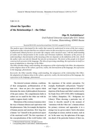 Библиографическое описание:Farkhitdinova, Olga. About the Specifics of the Relationships I – the Other = О специфике отношений Я – другой / O. M. Farkhitdinova. - Текст : непосредственный // Журнал Сибирского федерального университета. Гуманитарные науки. - 2013. - Т. 6, № 2. - С. 272-277. - Библиогр.: с. 276-277. - ISSN 1997-1370.