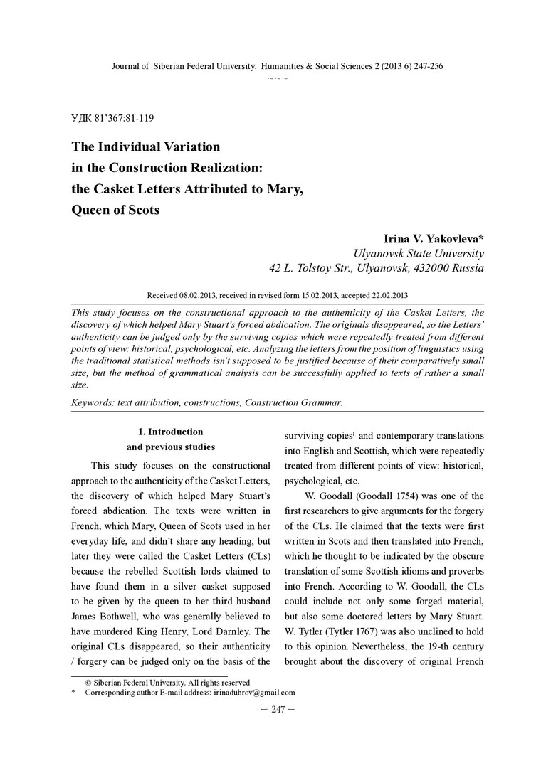 Библиографическое описание: Yakovleva, Irina. The Individual Variation in the Construction Realization: the Casket Letters Attributed to Mary, Queen of Scots = Индивидуальная вариативность в реализации конструкций: «письма из ларца», приписываемые Марии Стюарт / I. V. Yakovleva. - Текст : непосредственный // Журнал Сибирского федерального университета. Гуманитарные науки. - 2013. - Т. 6, № 2. - С. 247-256. - Библиогр.: с. 254-255. - ISSN 1997-1370.