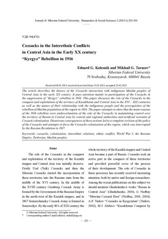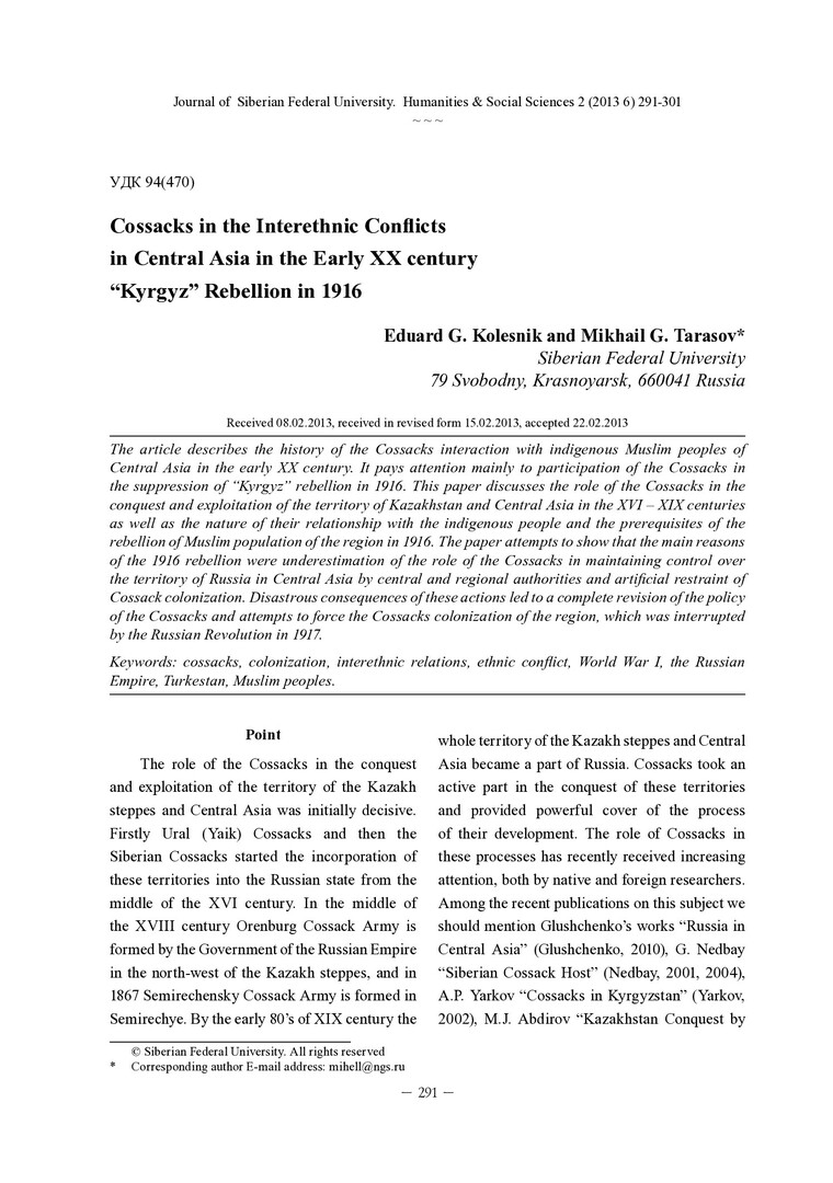 Библиографическое описание: Kolesnik, E`duard G... Cossacks in the Interethnic Conflicts in Central Asia in the Early XX century “Kyrgyz” Rebellion in 1916 = Казачество в межэтнических конфликтах на территории Центральной Азии в начале XX в. «Киргизское» восстание 1916 г. / E. G. Kolesnik, M. G. Tarasov. - Текст : непосредственный // Журнал Сибирского федерального университета. Гуманитарные науки. - 2013. - Т. 6, № 2. - С. 291-301. - Библиогр.: с. 299-301. - ISSN 1997-1370.