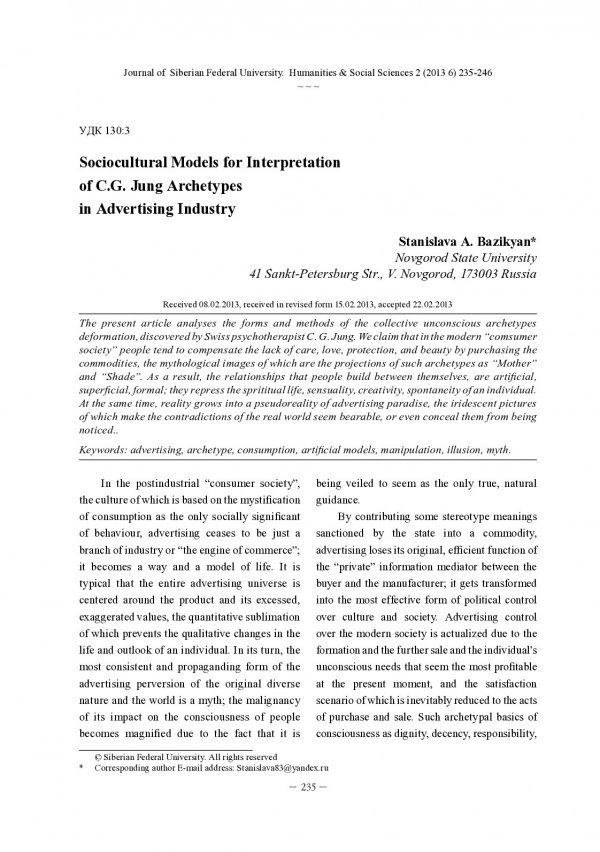 Библиографическое описание: Bazikyan, Stanislava. Sociocultural Models for Interpretation of C. G. Jung Archetypes in Advertising Industry = Социокультурные модели интерпретации архетипов К. Г. Юнга в рекламной индустрии / S. A. Bazikyan. - Текст : непосредственный // Журнал Сибирского федерального университета. Гуманитарные науки. - 2013. - Т. 6, № 2. - С. 235-246. - Библиогр.: с. 245 (6 назв.). - ISSN 1997-1370.