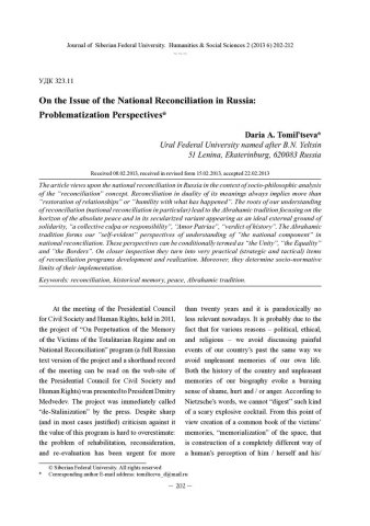 Библиографическое описание: Tomil`tseva, Daria. On the Issue of the National Reconciliation in Russia: Problematization Perspectives = К вопросу о национальном примирении в России: ракурсы проблематизации / D. A. Tomil`tseva. - Текст : непосредственный // Журнал Сибирского федерального университета. Гуманитарные науки. - 2013. - Т. 6, № 2. - С. 202-212. - Библиогр.: с. 211-212. - ISSN 1997-1370.