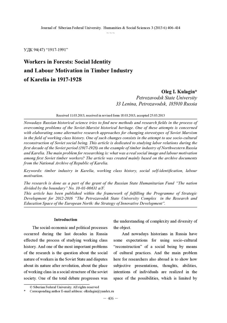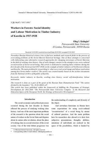Библиографическое описание: Kulagin, Oleg. Workers in Forests: Social Identity and Labour Motivation in Timber Industry of Karelia in 1917-1928 = Рабочие в лесах: социальная самоидентификация и трудовая мотивация в лесной промышленности Карелии в 1917-1928 годах / O. I. Kulagin. - Текст : непосредственный // Журнал Сибирского федерального университета. Гуманитарные науки. - 2013. - Т. 6, № 3. - С. 406-414. - Библиогр.: с. 413-414 (18 назв.). - ISSN 1997-1370.