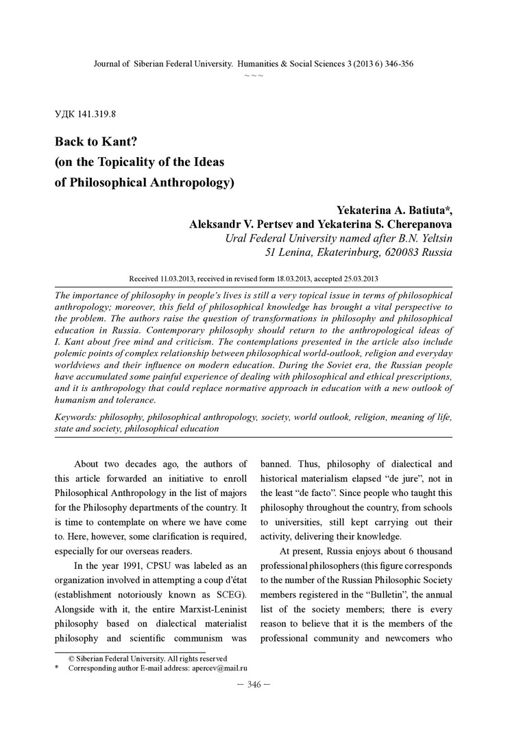 Библиографическое описание: Batiuta, Yekaterina. Back to Kant? (on the topicality of the ideas of philosophical anthropology) = Назад к Канту? (Об актуальности идеи философской антропологии) / Ye. A. Batiuta, A. V. Pertsev, Ye. S. Cherepanova. - Текст : непосредственный // Журнал Сибирского федерального университета. Гуманитарные науки. - 2013. - Т. 6, № 3. - С. 346-356. - Библиогр.: с. 355 (4 назв.). - ISSN 1997-1370.