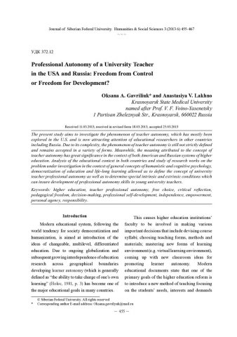 Библиографическое описание: Gavriliuk, Oksana. Professional Autonomy of a University Teacher in the USA and Russia: Freedom from Control or Freedom for Development? = Профессиональная автономность преподавателя университета в США и России: свобода от контроля или свобода для развития? / O. A. Gavriliuk, A. V. Lakhno. - Текст : непосредственный // Журнал Сибирского федерального университета. Гуманитарные науки. - 2013. - Т. 6, № 3. - С. 455-467. - Библиогр.: с. 463-466 (47 назв.). - ISSN 1997-1370.