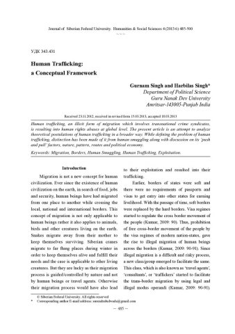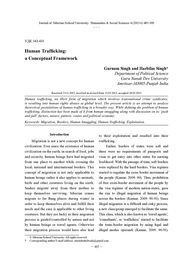 Библиографическое описание: Gurnam Singh. Human Trafficking: a Conceptual Framework = Торговля людьми: концептуальная основа / Gurnam Singh, Harbilas Singh. - Текст : непосредственный // Журнал Сибирского федерального университета. Гуманитарные науки. - 2013. - Т. 6, № 4. - С. 485-500. - Библиогр.: с. 498-500 (30 назв.). - ISSN 1997-1370.