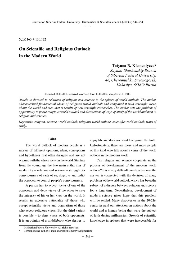 Библиографическое описание: Klementyeva, Tatyana. On Scientific and Religious Outlook in the Modern World = О научном и религиозном мировоззрении в современном мире / T. N. Klementyeva. - Текст : непосредственный // Журнал Сибирского федерального университета. Гуманитарные науки. - 2013. - Т. 6, № 4. - С. 544-554. - Библиогр.: с. 552-553 (36 назв.). - ISSN 1997-1370.