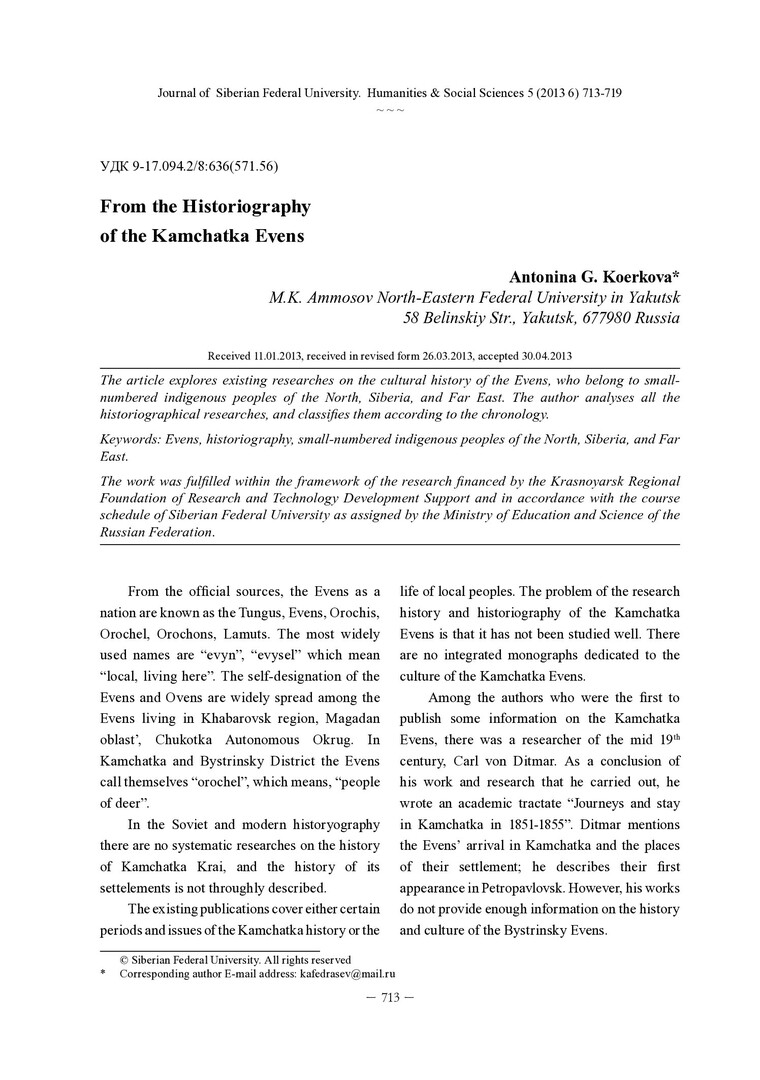 Библиографическое описание:Koerkova, Antonina. From the Historiography of the Kamchatka Evens = Из историографии эвенов Камчатки / A. G. Koerkova. - Текст : непосредственный // Журнал Сибирского федерального университета. Гуманитарные науки. - 2013. - Т. 6, № 5. - С. 713-719. - Библиогр.: с. 718-719 (12 назв.). - ISSN 1997-1370.