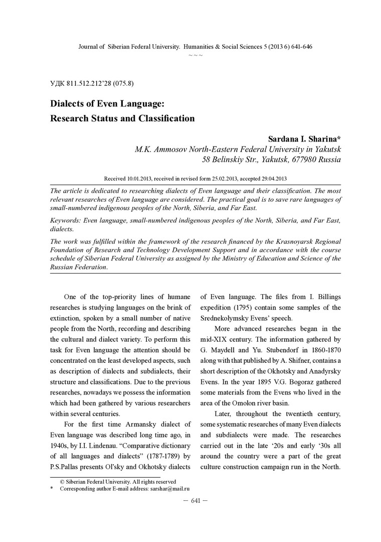 Библиографическое описание:Sharina, Sardana. Dialects of Even Language: Research Status and Classification = Диалекты эвенского языка: состояние исследований и классификация / S. I. Sharina. - Текст : непосредственный // Журнал Сибирского федерального университета. Гуманитарные науки. - 2013. - Т. 6, № 5. - С. 641-646. - Библиогр.: с. 645 (10 назв.). - ISSN 1997-1370.