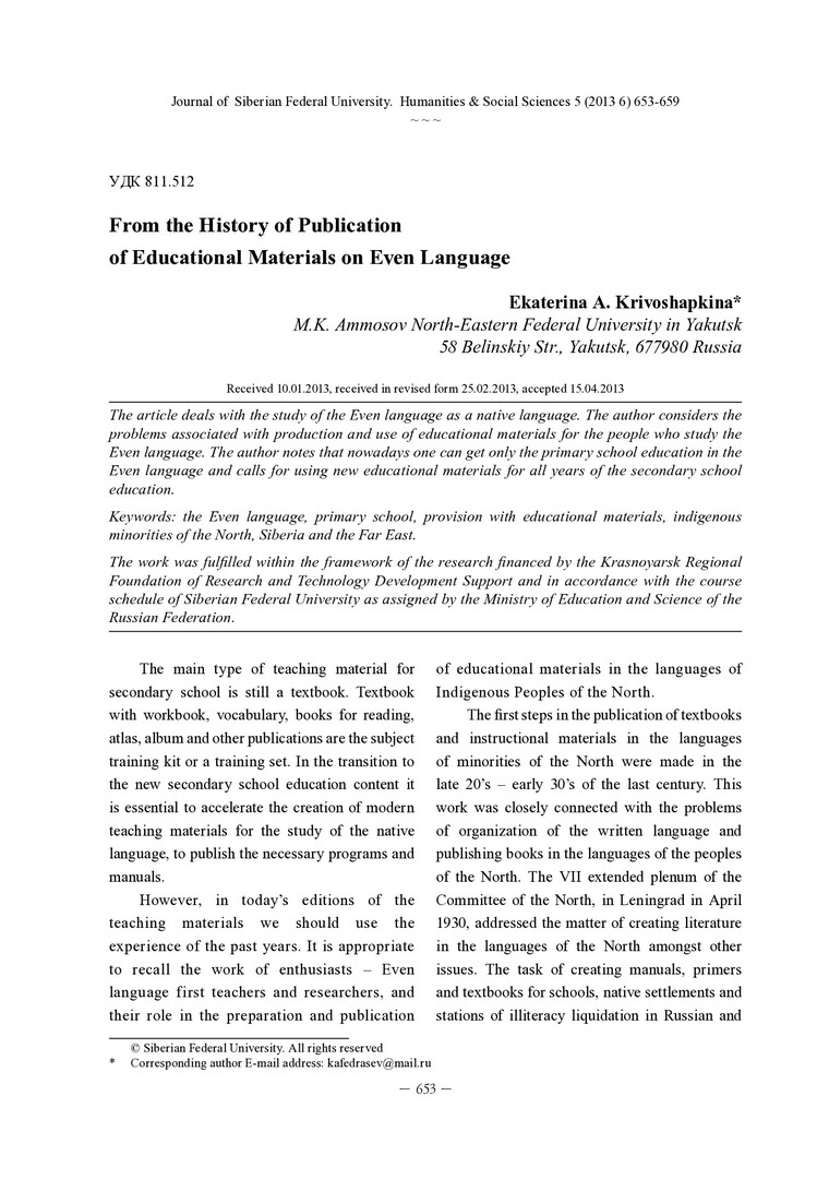 Библиографическое описание: Krivoshapkina, Ekaterina. From the History of Publication of Educational Materials on Even Language = Из истории издания учебно-методической литературы по эвенскому языку / E. A. Krivoshapkina. - Текст : непосредственный // Журнал Сибирского федерального университета. Гуманитарные науки. - 2013. - Т. 6, № 5. - С. 653-659. - Библиогр.: с. 658 (3 назв.). - ISSN 1997-1370.
