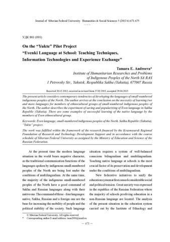 Библиографическое описание:Andreeva, Tamara. On the “Yukte” Pilot Project “Evenki Language at School: Teaching Techniques, Information Technologies and Experience Exchange” = О пилотном проекте «Юктэ» «Эвенкийский язык в школе: методика обучения, информационные технологии и обмен опытом» / T. E. Andreeva. - Текст : непосредственный // Журнал Сибирского федерального университета. Гуманитарные науки. - 2013. - Т. 6, № 5. - С. 671-675. - Библиогр.: с. 674 (3 назв.). - ISSN 1997-1370.